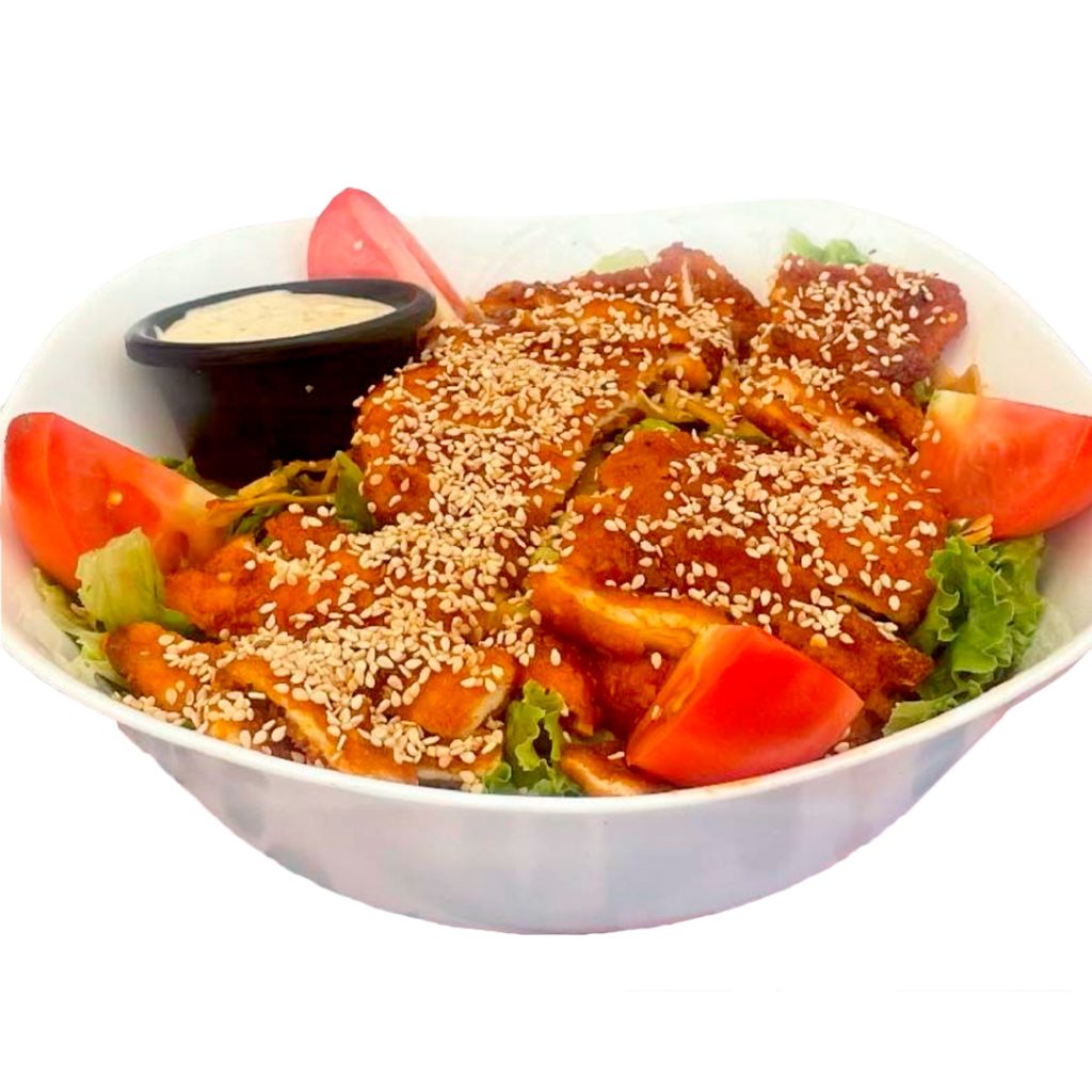 Mezcla de espinaca y lechuga fresca, arándanos, durazno en almíbar, fresa, nuez, queso de cabra y vinagreta de naranja con aderezo de mostaza miel.