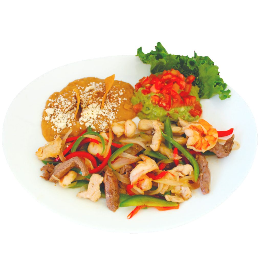 Puntas de res y adobada, quesadillas, nachos, guacamole y tacos dorados de pollo.